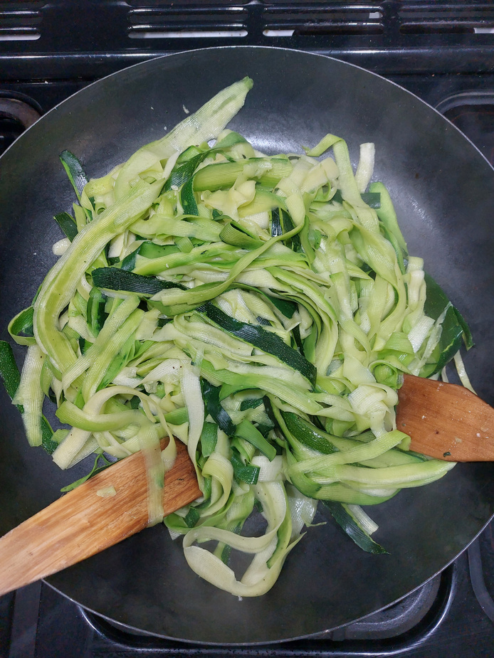 Courgettes make a wonderful alternative to Pasta on occasions you fancy a low-carb meal. They're super-easy to prepare. Feed them through a slicer (I used a potato peeler), toss them in a little olive oil and warm them in a large skillet or pan.