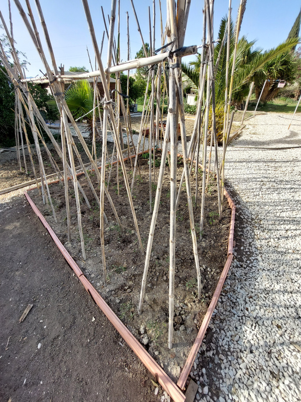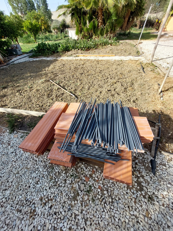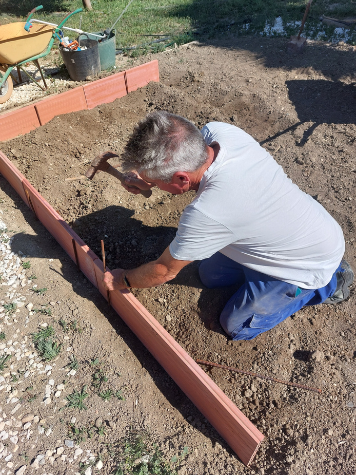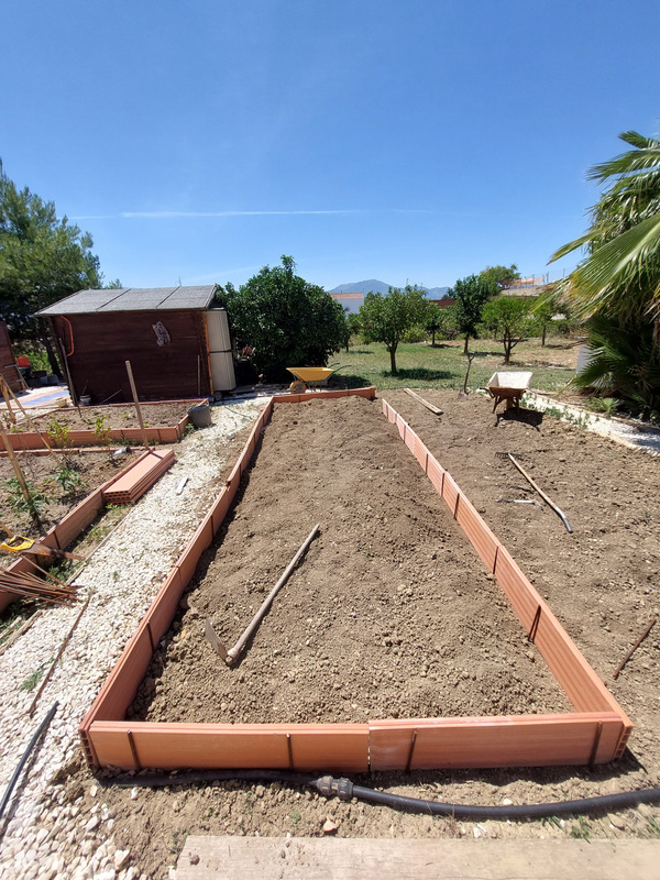 We've used long ceramic bricks called raciones (ra-see-on-ehs) and iron rods which have been cut down to secure the blocks in place. The raciones are about 30cm deep by 1m long. They won't decay or rot, and their size makes them ideal for raising our beds to just a little above ground level. We've filled the beds with fresh compost, existing soil, and locally supplied manure.