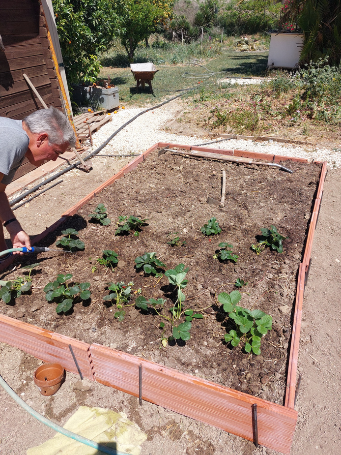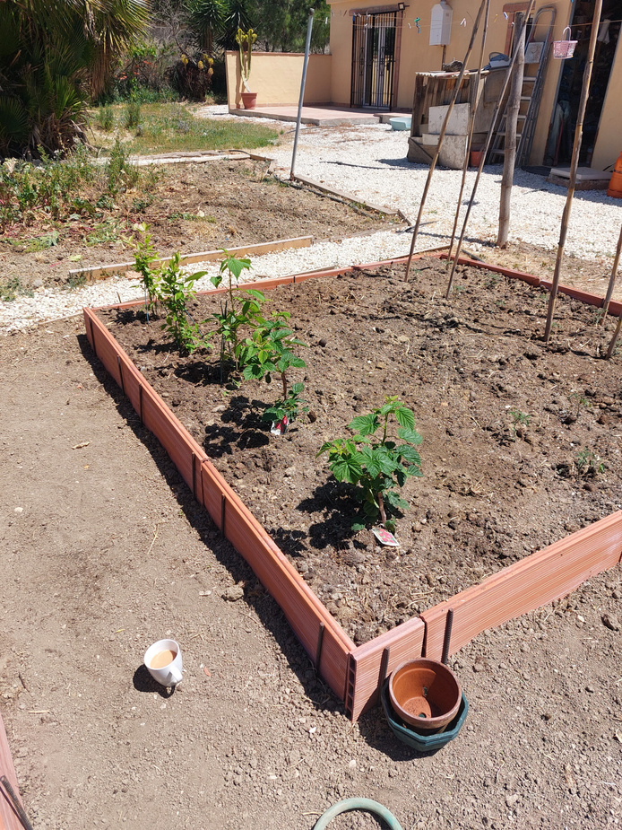 Scott has created two more beds. We have a follow-up crop of tomatoes and fruit (Raspberries, Arandanos (Blueberries), and Strawberries. I think we should have some sort of fruit cage but Scott's in charge and he's not listening to me. We'll see what happens.