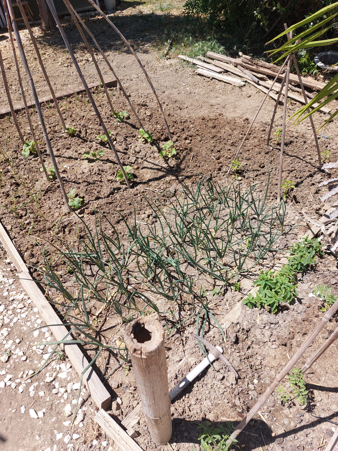 After the same two week period our onions are doing well and the melons (top) and peppers are not far behind. (Spot the wild mint growing near the top right of the picture. That will need controlling. Moroccan Tea anyone?