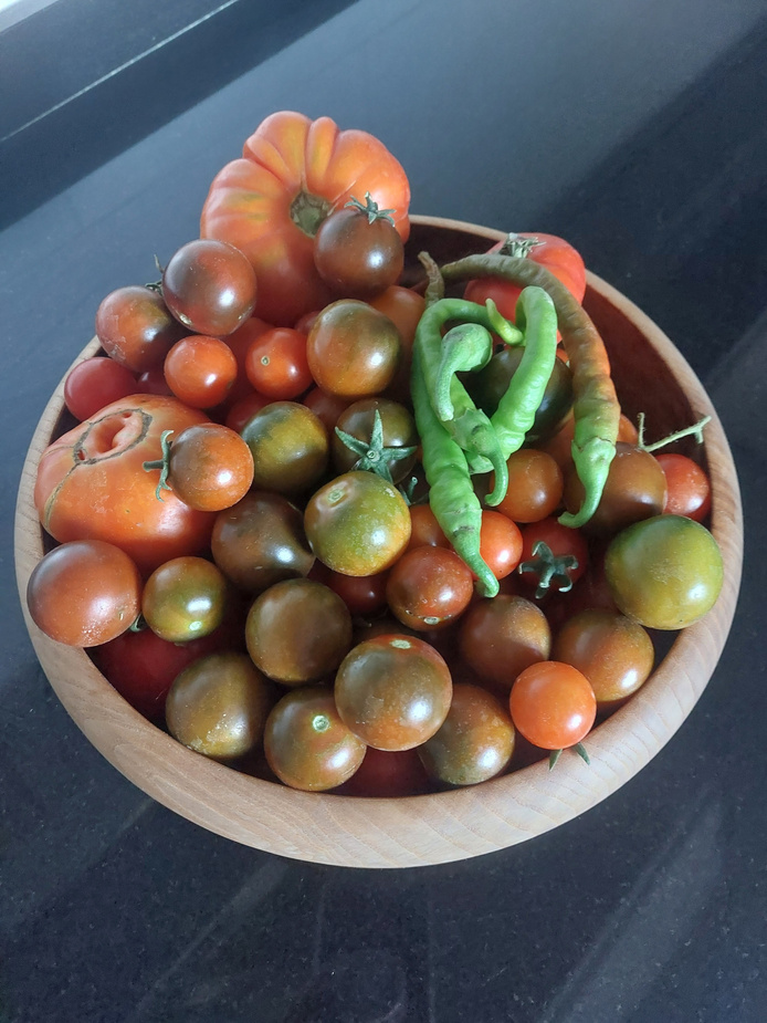 We are harvesting courgettes, runner beans, cucumbers, tomatoes (including our later sown cherry varieties), peppers, and onions. Our Honeydew melons are beginning to fatten up nicely too.