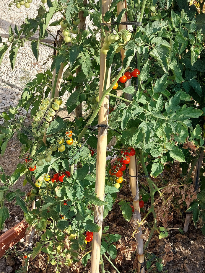 Our tomatoes, two weeks between planting. This is the time to start tying them to the stakes and pinching out the unwanted shoots. See the 'how to' video if you're not sure how to do this.