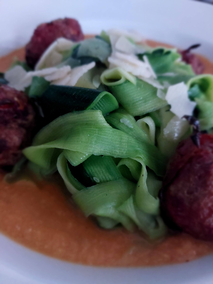 We served ours with home-made meatballs and a sauce made from the bits of courgette I couldn't slice (plus some other stuff!). A sprinkle of Parmesan shavings added a dash of "Italian-ness!"